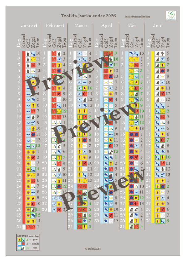 - Een super handig Tzolkin jaaroverzicht van alle kastelen, golven, zonnetekens en tonen per dag en maand.